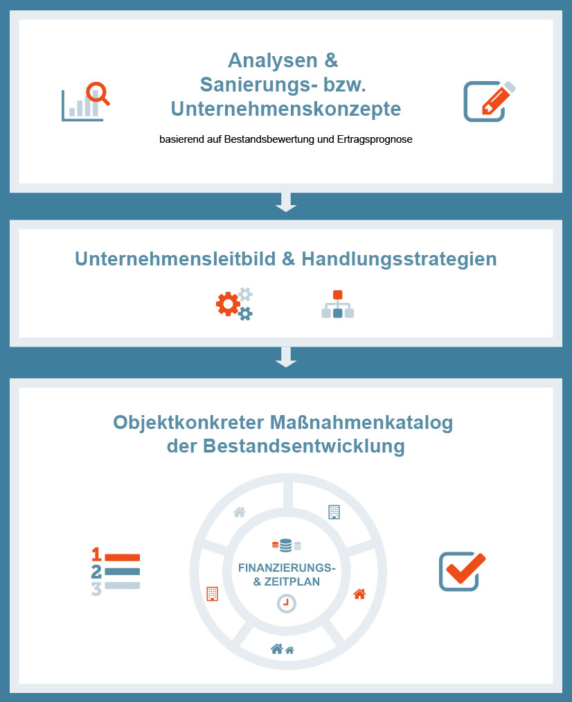Im Dialog mit unserem Auftraggeber entwickeln wir Unternehmensleitbild und Handlungsstrategien für die einzelnen Geschäftsfelder. Kern des Konzepts ist ein objektkonkreter Maßnahmenkatalog der Bestandsentwicklung, der auf einem durchgerechneten Finanzierungs- und Zeitplan beruht.